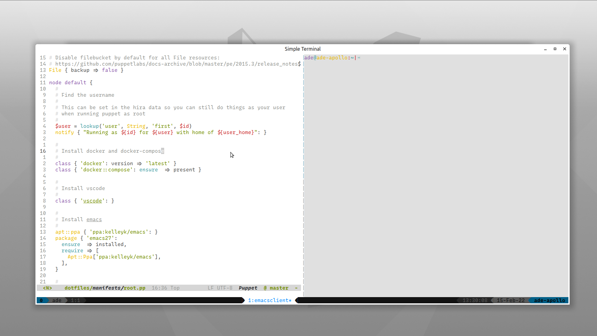 This is my over complicated system configuation managed with Puppet, containing all the usual tools you would expect from a terminal development workflow.